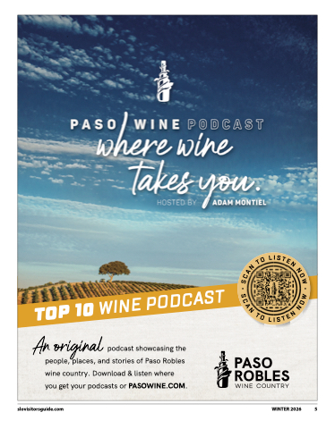 slovisitorsguide.com WINTER 2026 5 podcast showcasing the people, places, and stories of Paso Robles wine country. Download & listen where you get your podcasts or PASOWINE.COM. An original TOP 10 WINE PODCAST