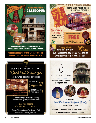 6 WINTER 2026 slovisitorsguide.com 1240 Park Street, Downtown Paso robles Open Daily at 4pm for dinner & cocktails Happy Hour Mon-Fri • 4pm-6pm exotic asian fusion dishes & delicious cocktails Family Friendly! CaneTikiRoom.com • (805) 227-7113